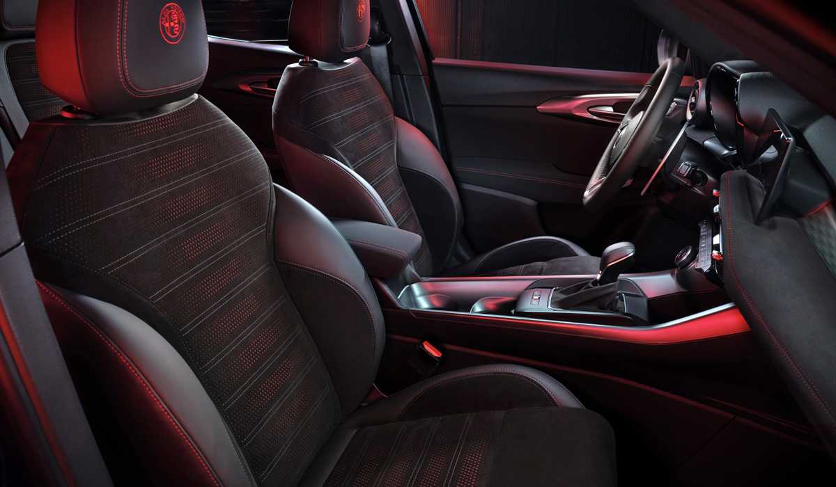 Оформление салона паркетника тоже соответствует итальянскому духу: околоспортивный дизайн с красными акцентами, имитация аналоговых приборов в «колодцах», круглые воздуховоды, классический рычаг КПП, имитация спортивного профиля передних кресел. Интересная «фишка» – кнопка запуска мотора на рулевом колесе, а в остальном все на своих местах: современный 10.25-дюймовый тачскрин медиасистемы, 12.3-дюймовая виртуальная «приборка» с несколькими режимами отображения, а также шайба выбора ездовых режимов, которую решили расположить на возвышении кожуха центрального тоннеля.