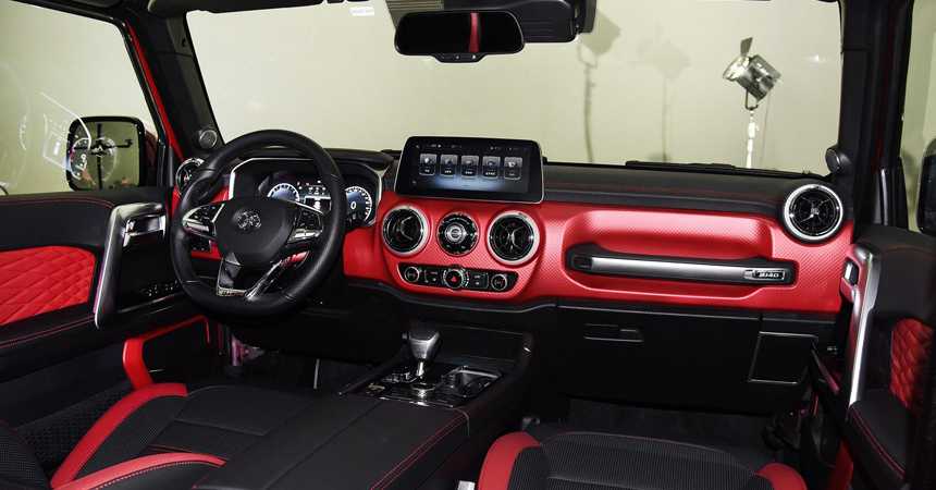 Люксовая комплектация BAIC BJ40 Plus получила абсолютно новый дизайн интерьера с обилием контрастных вставок. На передней панели появились новомодные сенсорные дисплеи – цифровая «приборка» и экран медиасистемы, передние сидения получили электроприводы, а на центральном тоннеле рычаг управления трансмиссией приобрел вид небольшого джойстика, соседствующего с вращающейся шайбой.