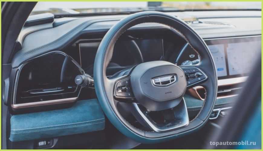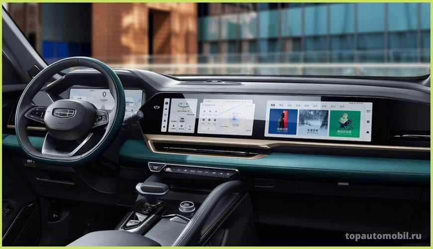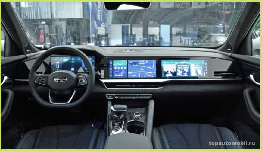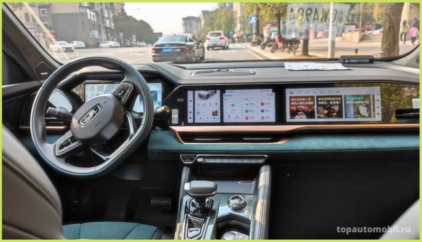 Джили оснастила свой автомобиль новейшими интерьерными технологиями. Китайский кроссовер имеет приборную панель, включающую в себя тройные экраны, общей длиной 1 метр, один из которых представляет собой 12,3-дюймовую цифровую приборную панель, другой — сенсорный экран информационно-развлекательной системы, а последний — сенсорный экран для переднего пассажира.