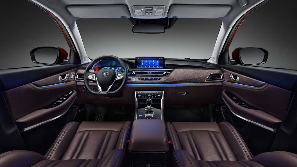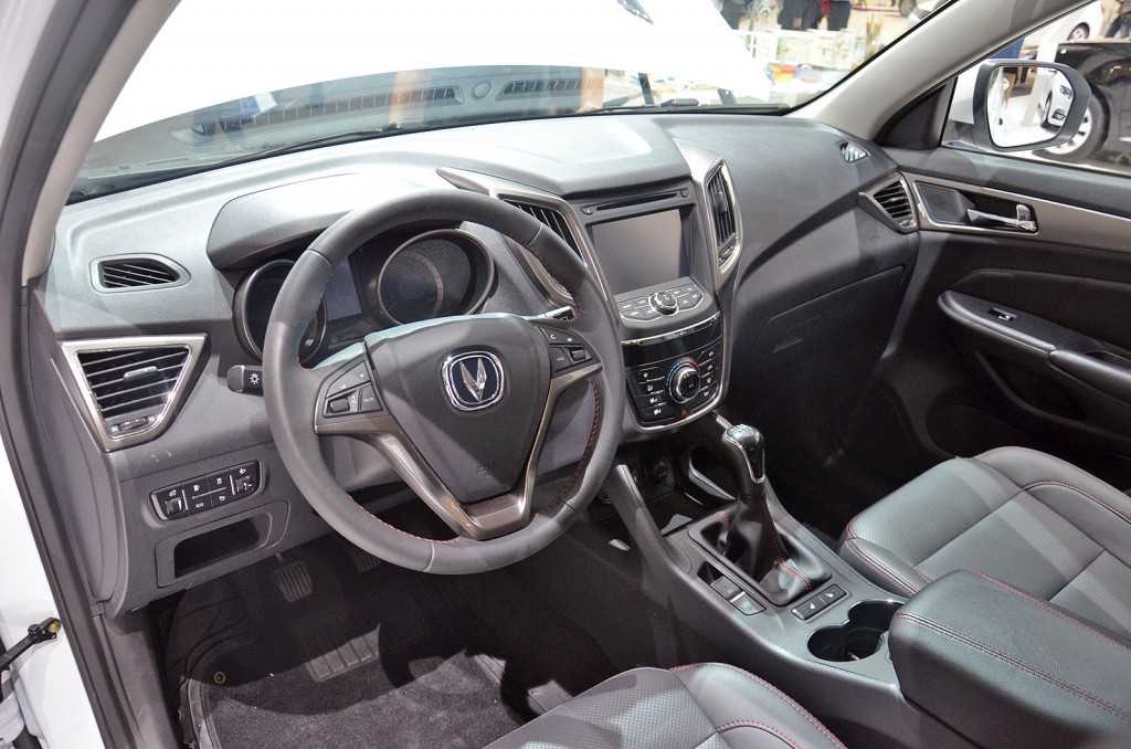 Оказавшись в салоне авто марки Changan, нельзя не отметить приятный, лаконичный дизайн его интерьера. Передняя панель изготовлена из жесткого фактурного пластика, на центральной консоли красуется глянцевая вставка. Архитектура приборной панели стилизована под букву V, которая присутствует на логотипе концерна Changan Automobile Group. Циферблаты на приборной доске имеют умеренную синюю подсветку. Руль обтянут эко-кожей с красной строчкой.