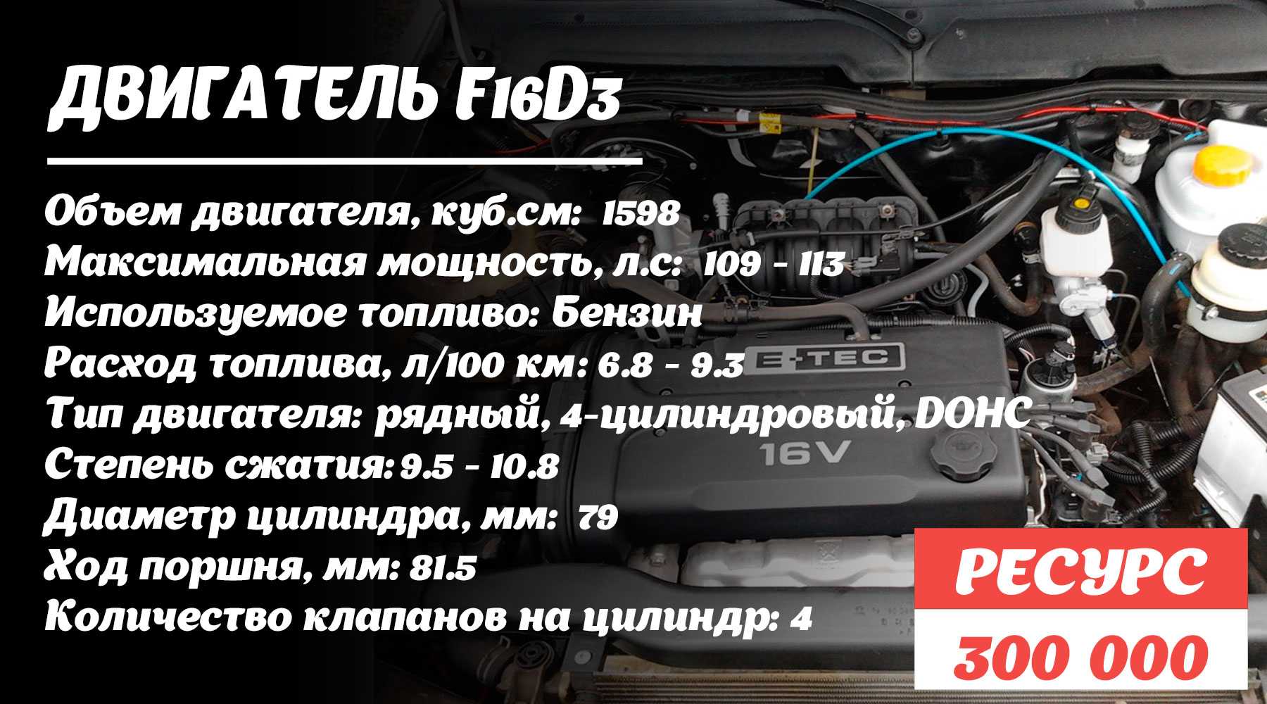 Второй двигатель — это более мощный и тяговитый агрегат F16D3, объемом 1.6 литра с 16-клапанами, выдающий 109 сил и крутящий момент 150 Hm. Устанавливается также на модели Chevrolet Aveo, Lacetti. Часто его называют Лачетевским мотором. По сравнению с 1,5 этот ДВС отличается лучшей тягой, например разгон с нуля до сотни у него занимает 11 секунд. При этом, расход топлива не сильно отличается : по городу — 9,3 л, по трассе — 8,5, в смешанном — 9 л.