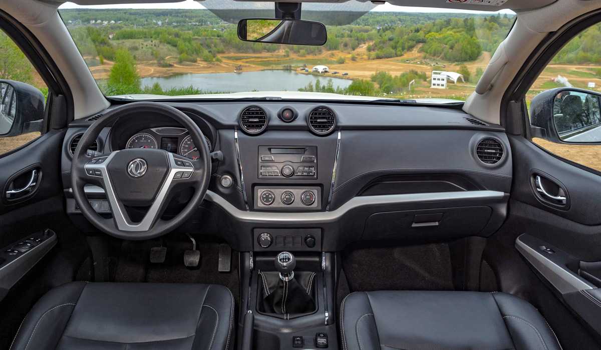 Материал передней консоли в кабине Dongfeng Rich 6 2022 года явно не дотягивает до качества материалов отделки японского аналога, к тому же здесь используется более простое оснащение. Небольшой экран мультимедийной системы может выводить изображение с опциональной камеры заднего вида, приборная панель только аналоговая, а в «базе» предлагается кондиционер, который, опять-таки, за дополнительные деньги можно заменить климат-контролем. Также возможными пунктами оснащения пикапа являются бесключевой доступ, кнопочный запуск двигателя, парктроник, а также электроприводы и подогревы передних сидений.