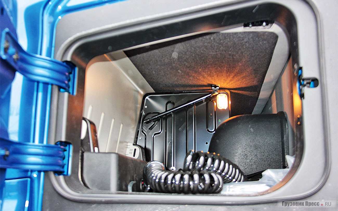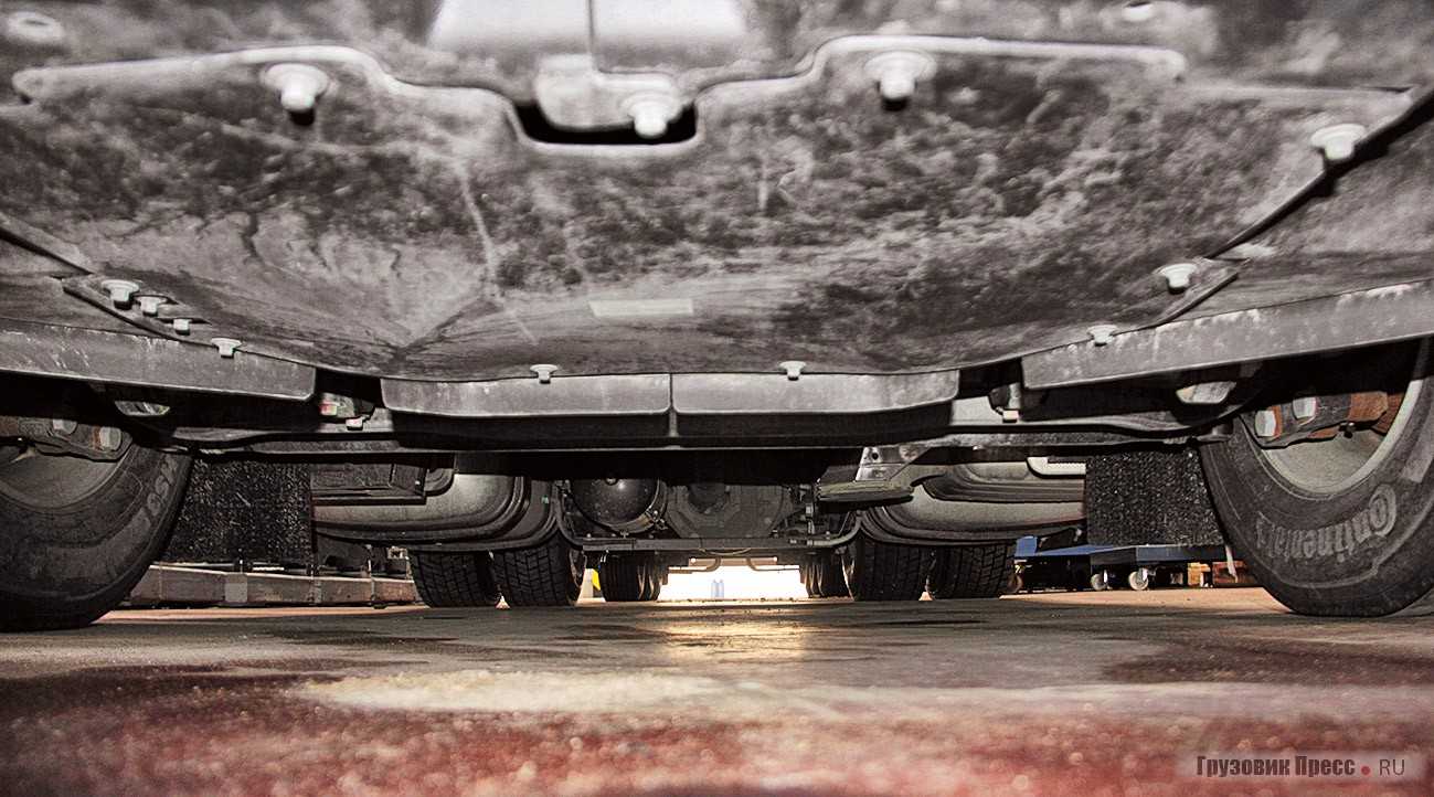 Высота сечения лонжеронов рамы – 285 мм, толщина профиля – 8 мм, колёсная база – 3,6 м, задний свес – 0,87 м. На раме два топливных бака 600 и 450 л, по левому и правому борту, при этом 2 АКБ по 225 Ач расположились вертикально одна над другой справа в базе.