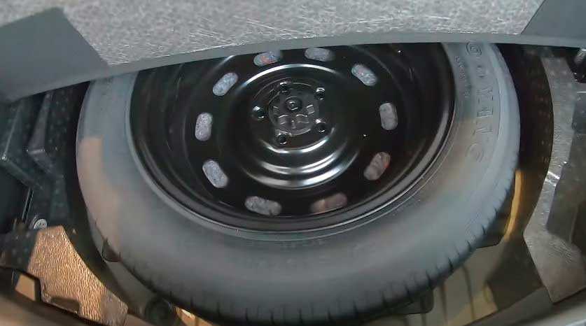 В «подполье» находится малоразмерная запаска, она уложена в широкий пенопластовый органайзер, где также хранится дорожный инструмент, никакой шумоизоляции снизу нет.