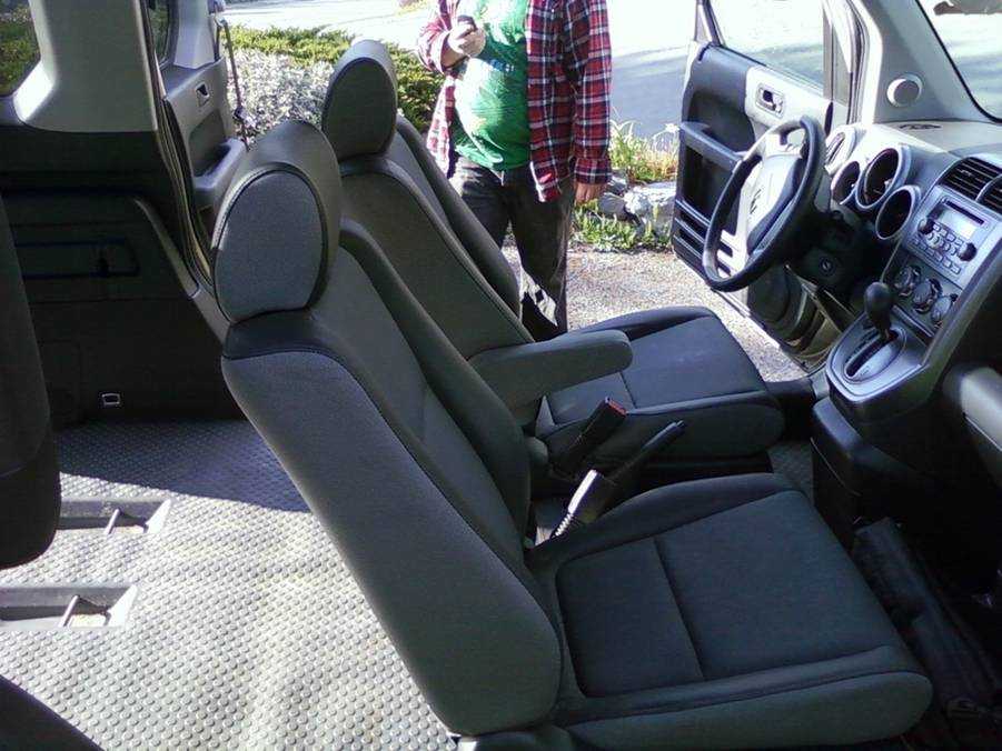 Кубическая форма Honda Element позволила увеличить объём не только багажного отсека, но и салона. Внутри кроссовера достаточно места для водителя и пассажиров любого роста. Однако из-за небольшой ширины на заднем ряду могут поместиться только 2 человека – тем более что это кресло разделено ровно пополам.