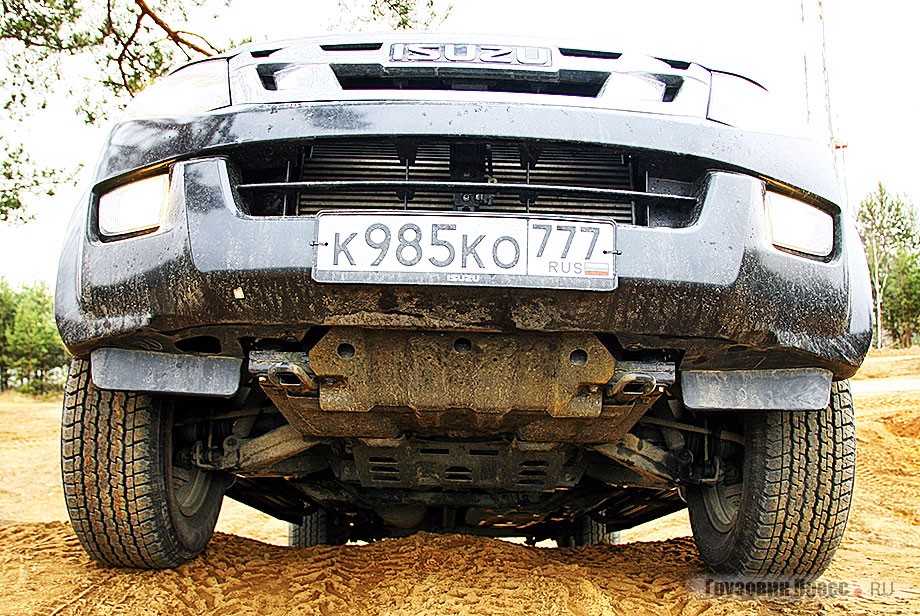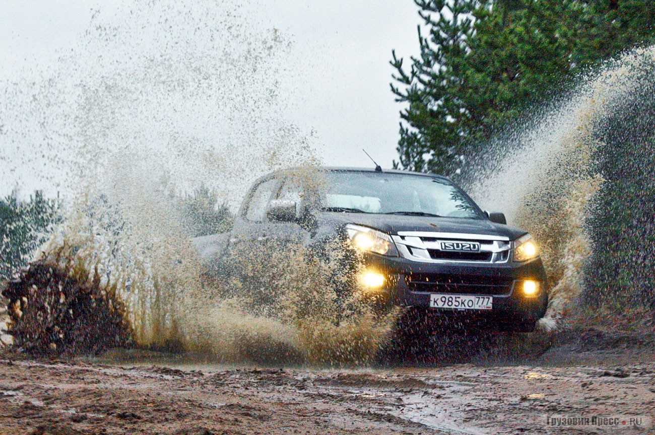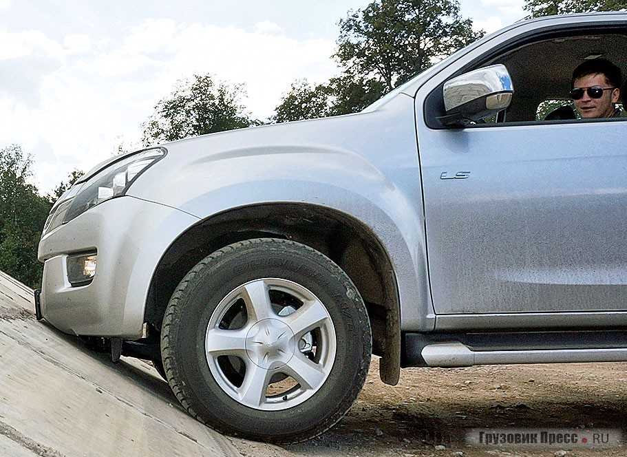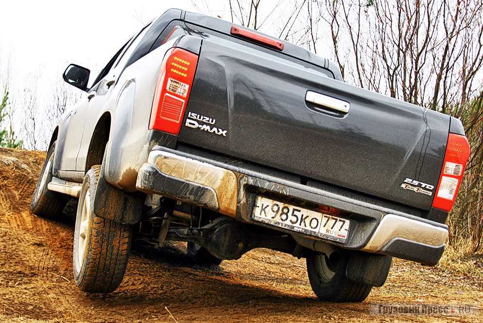 Коллеги из «внедорожных» изданий сетовали на отсутствие принудительной блокировки заднего дифференциала, но я, покатав машину и по умеренной грязи, и по среднестатистическому снегу, могу смело утверждать, что Isuzu D-Max и без того неплохо едет, так что в данном случае отсутствие этой, несомненно, полезной опции некритично. Благодаря клиренсу 235 мм и хорошим ходам подвески, вывесить машину «в диагональ» очень трудно. Чтобы сделать показательные кадры, пришлось несколько раз менять угол подъезда, чтобы заднее колесо наконец-то оторвалось от земли.