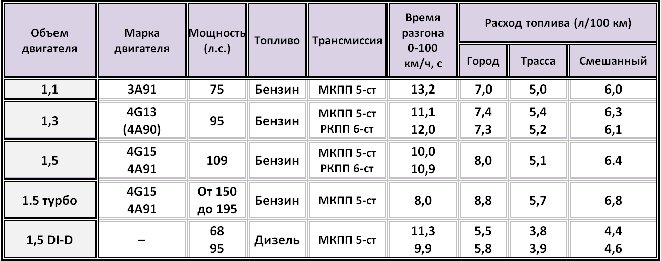 | Colt 1.3 бензин | 95 л.с. при 6000 об / мин | 125 Н · м при 4000 об / мин | 10,8 с |