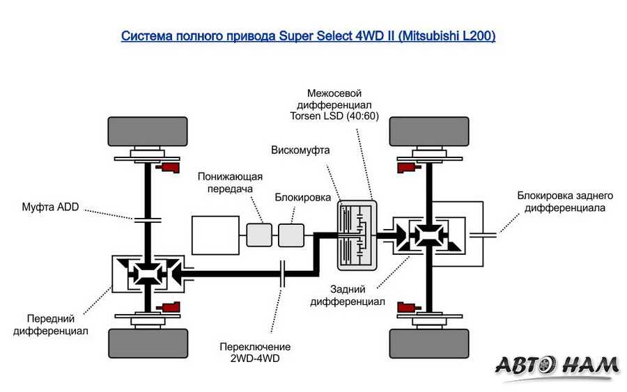 Система полного привода Super Select 4WD II включает в себя механизм переключения между режимами 2WD/4WD, понижающий ряд, центральный дифференциал Torsen с возможностью блокировки, передний дифференциал с муфтой ADD, задний дифференциал с возможностью блокировки. Режим работы привода выбирается с помощью селектора на центральном тоннеле. Всего предусмотрено четыре положения: 2H, 4H, 4HLc и 4LLc.