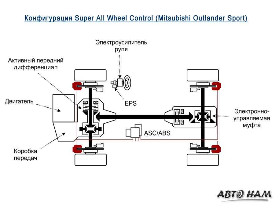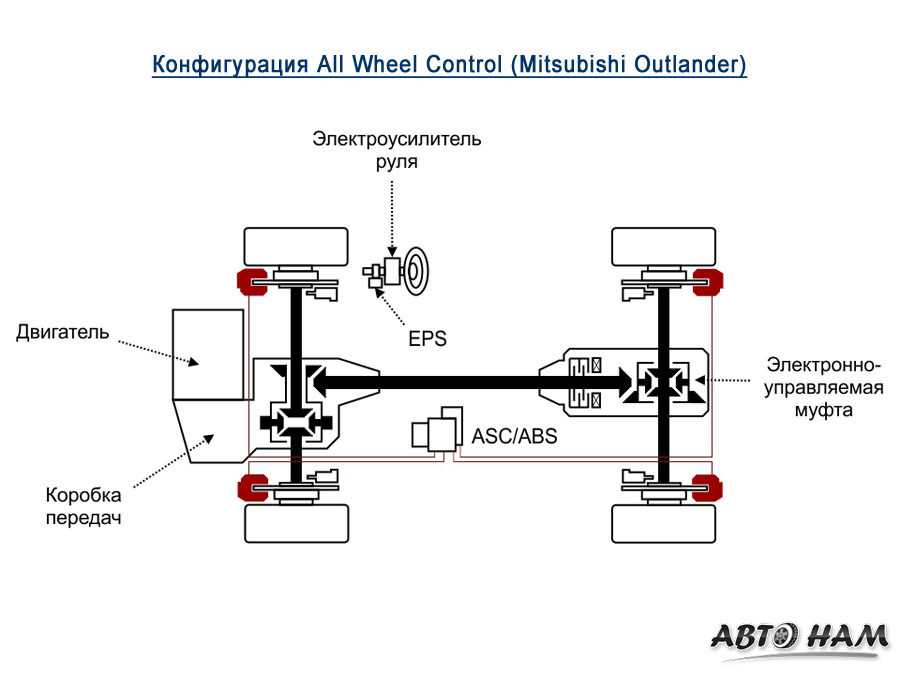 Система All Wheel Control (AWC) представляет собой переднеприводную конфигурацию, в которой задняя ось подключается с помощью управляемой электроникой электромагнитной муфты. Назад может направляться до 50 % тяги. Существует три режима работы привода AWC – ECO, Auto и Lock. В экономичном режиме весь крутящий момент по умолчанию передается на переднюю ось, а задняя задействуется только при пробуксовке. Режим Auto распределяет усилие оптимальным образом, исходя из получаемых электронным блоком данных (скорости колес, положения педали акселератора). Режим блокировки увеличивает количество передаваемого на задние колеса крутящего момента, что гарантирует уверенный разгон и более стабильное поведение на нестабильной поверхности. Главное отличие Lock от Auto заключается в том, что задние колеса изначально получают больше тяги независимо от того обнаружено ли проскальзывание или нет.