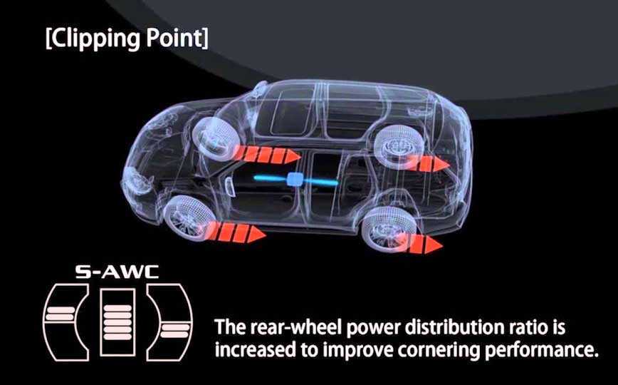 Авто оснащается системой полного привода S-AWC с электронным управлением и гидравлической муфтой, с изменением вектора тяги, наиболее дорогие версии на передней оси дополняются дифференциалом.