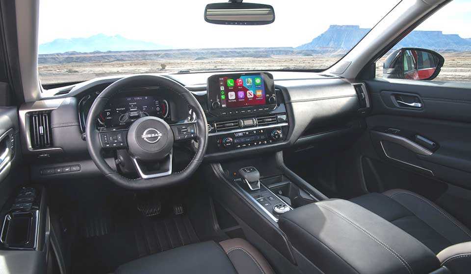 Производитель оснастил Nissan Pathfinder просторным и комфортабельным салоном. Автомобиль способен вместить одновременно семь пассажиров, а также предлагает большой объем багажного отделения (при необходимости можно сложить третий ряд кресел, увеличив багажник практически в два раза). Самой главной особенностью салона транспортного средства является возможность его трансформации. Данный внедорожник отлично подойдет для тех людей, которые любят путешествовать с комфортом, так как производитель предусмотрел больше 60 вариантов компоновки. Машина укомплектована различными ящичками и полочками, которые невидно невооруженным взглядом. Это было создано доя того, чтобы обеспечить максимальную функциональность салона без ущерба его просторности. Традиционно для отделки применялись высококачественные материалы. К примеру, транспортные средства, которые поставлялись на российский автомобильный рынок укомплектовывались мощной аудиосистемой, наружными зеркалами, большим бортовым компьютером, а также современным климат-контролем.