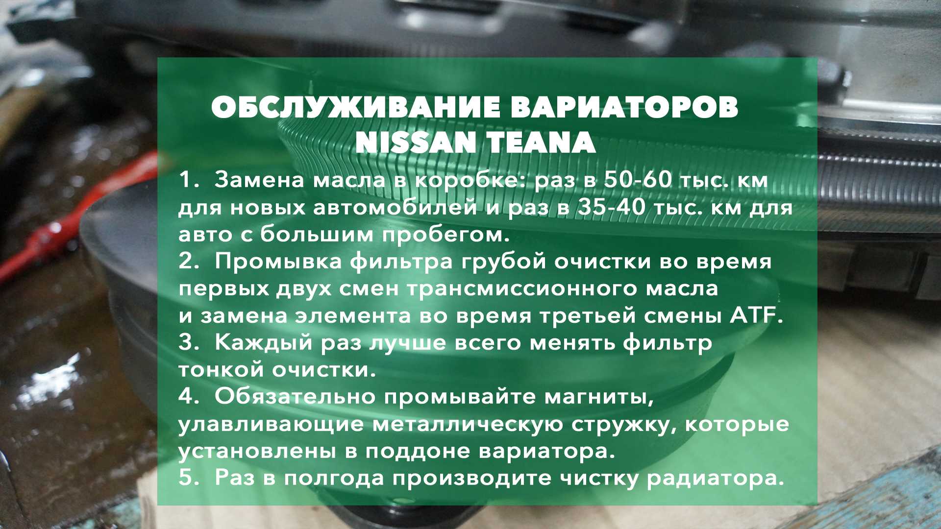 Одним из уязвимых мест Nissan Teana ll по праву считается вариатор. Бережная эксплуатация автомобиля подразумевает собой регулярную смену масла в автоматической коробке передач и, по возможности, уменьшение трения из-за езды на большой скорости. Признаками проблем становятся нарушения в работе ремня, редукционного клапана масляного насоса и гидроблока. Вероятность их возникновения возрастает с увеличением пробега. Чуть реже возникает необходимость в ремонте дифференциала и подшипников. По мнению специалистов, ремонт вариатора является отсрочкой его замены.