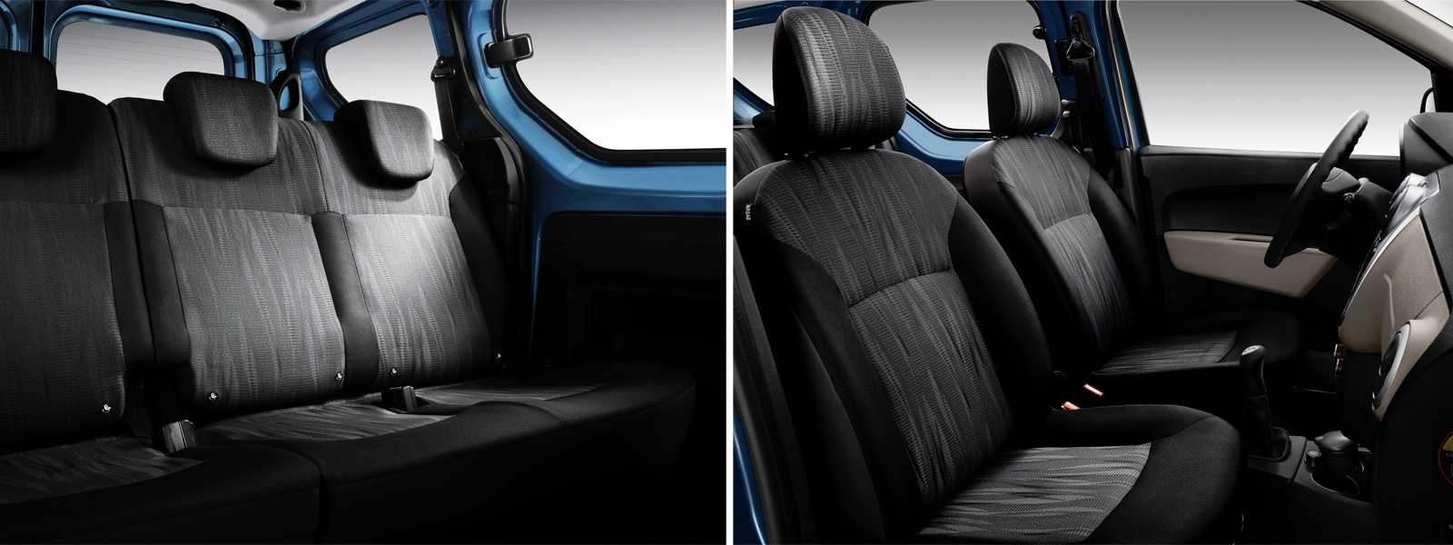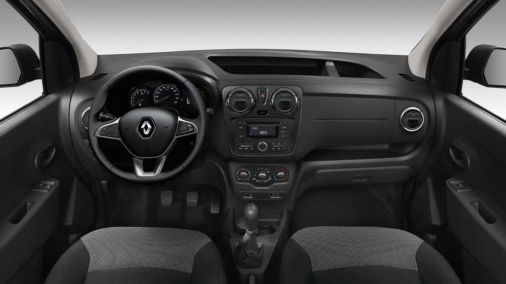 Интерьер «докера» оформлен в полном соответствии с назначением автомобиля: недорого и практично. Обивка тканевая, а отделочные материалы откровенно «бюджетные»: кругом недорогие жесткие пластики. Невысокий класс, но износостойкость несомненная – по самым разным условиям эксплуатации. Передняя панель бесхитростного дизайна унифицирована с «близкородственным» Lodgy: просто и функционально. Сиденье водителя перемещается продольно, а за возможность перестановки по высоте придется доплатить (33 евро). Как и за настройку «баранки» по углу наклона (25 евро), тогда как регулировка по вылету не предусмотрена вовсе. Спартанская обстановка.