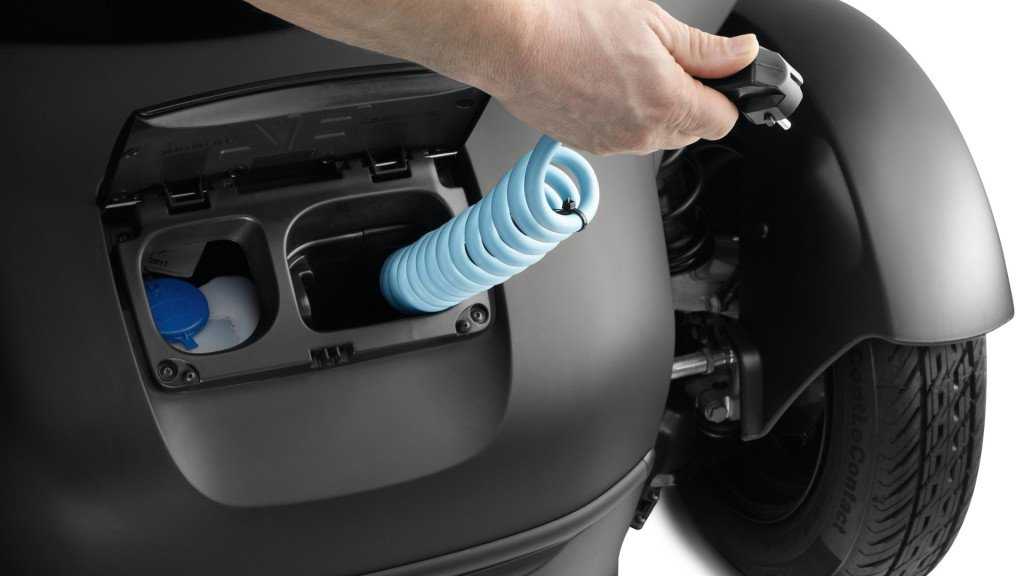 Для облегчения процесса зарядки в электромобиле Twizy предусмотрено зарядное устройство и встроенный кабель длиною 3 метра. Все это находится пол специальным люком в передней части электромобиля.