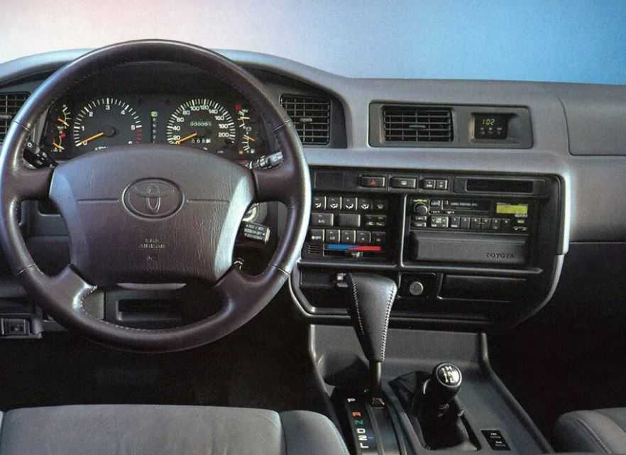 Приборная панель land cruiser располагает двумя главными циферблатами тахометра и спидометра, а также четырьмя небольшими второстепенными циферблатами. После рестайлинга машины от 1995-го года выпуска получили квадратную приборку, разделенную на несколько сегментов, а не единым блоком.