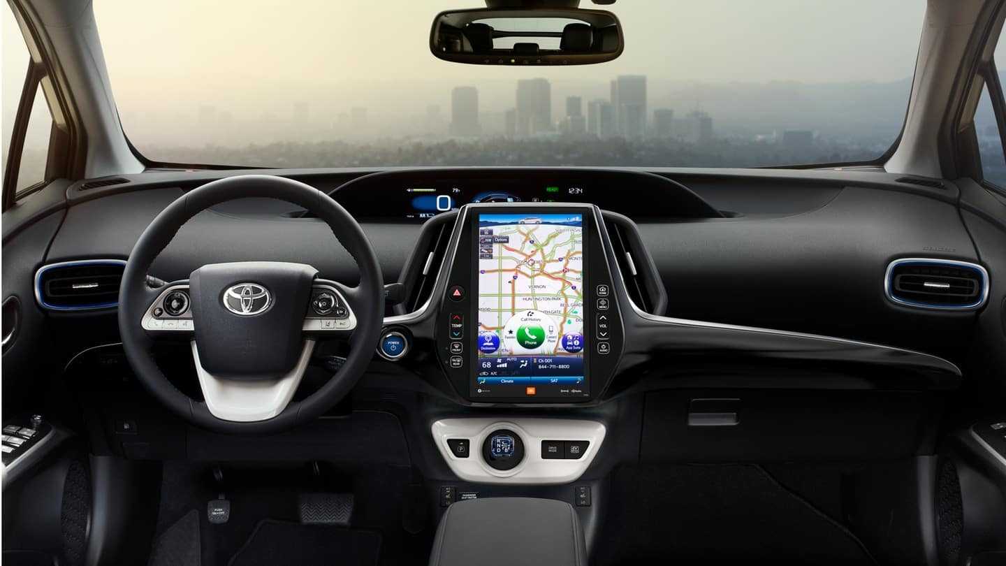 Рестайлинг салона отличается простотой и практичностью. Мало элементов из кожи. Большая часть отделки выполнена из качественного пластика и прочной обивочной ткани. В приборной панели расположены все нужные водителю опции и кнопки управления автомобилем. Комфортное управление повлияло на стоимость нового электрокара. На Toyota Prius 2018 цена изначально планировалась высокой. Все основные настройки авто находятся в мультимедийном отсеке с полногабаритным дисплеем.