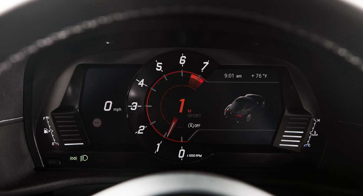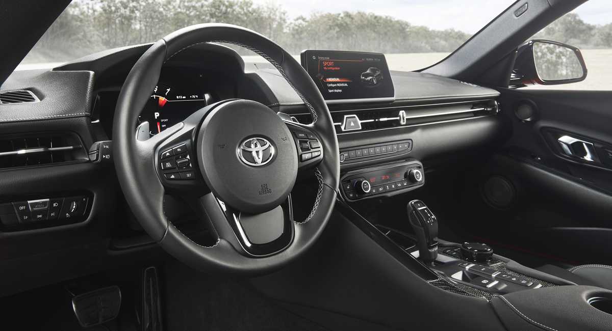 Пилот купе управляет им через 3-спицевую кожаную баранку с кнопками управления круизом и музыкой. За рулем Supra установили электронную панель приборов с 8-дюймовым дисплеем, имитирующий аналоговый датчик тахометра с интегрированным спидометром.