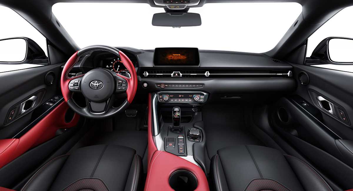 Салон новой Тойоты Супра 2020 по своей компоновке напоминает салон БМВ, поэтому здесь тот же центральный 12,3-дюймовый тачскрин, способный работать с Android Auto и Apple CarPlay, но в японском исполнении он торчит над панелью. На центральном тоннеле – очень похожий рычаг трансмиссии и такая же знакомая шайба.