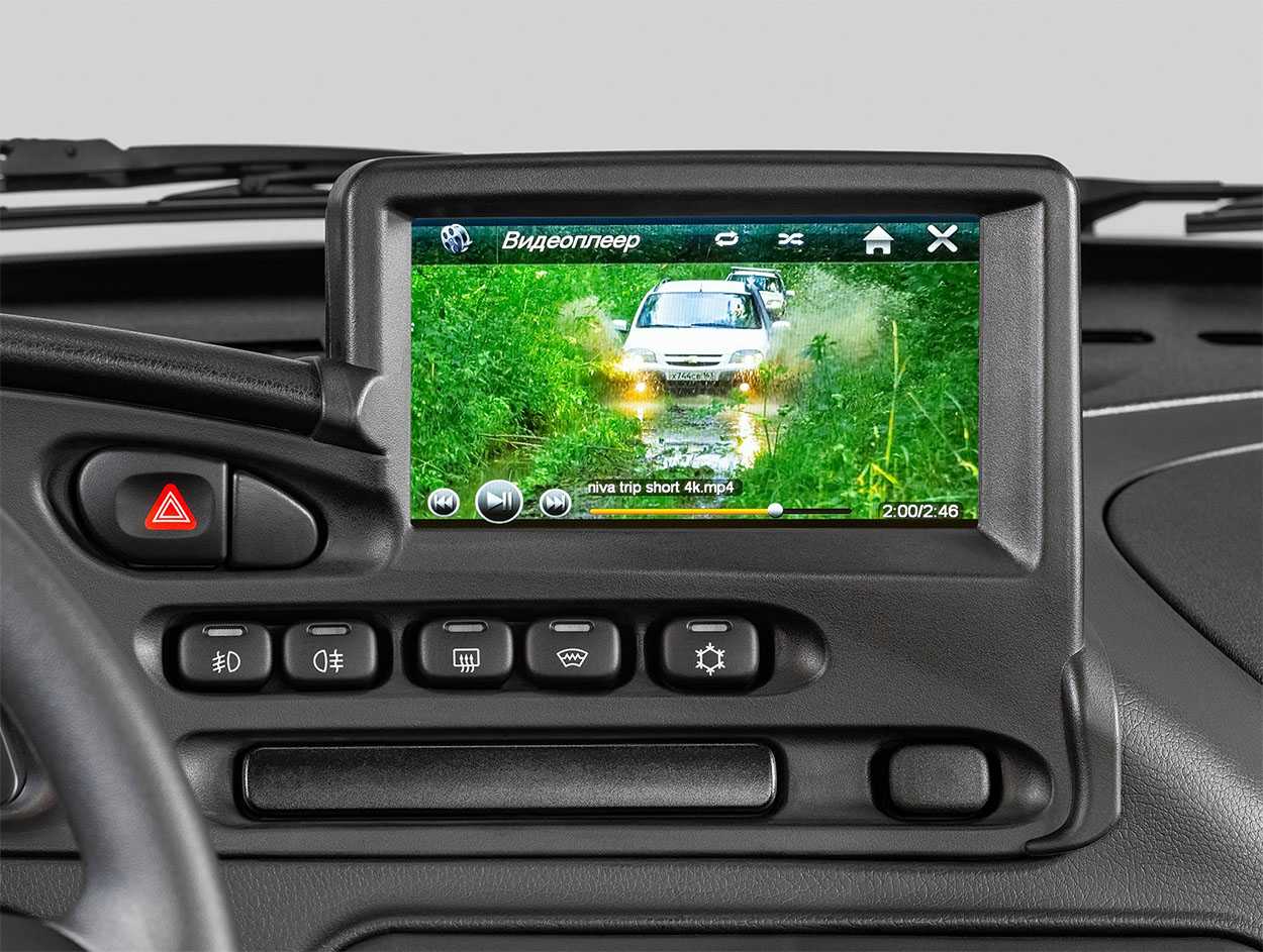 Интерьер внедорожника Шевроле Нива в версии 2020 года обзавелся новой мультимедийной системой, управление которой осуществляется через семидюймовый тачскрин.