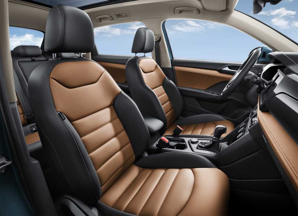В общих чертах интерьер Volkswagen T Cross схож с салоном Volkswagen Polo, но передние кресла в T Cross установлены на 100 мм выше. Задний ряд кресел выше переднего на 55 мм, такое расположение напоминает принцип кинотеатров. Передняя панель отличается массивностью и может похвастаться более лучшим обзором.
