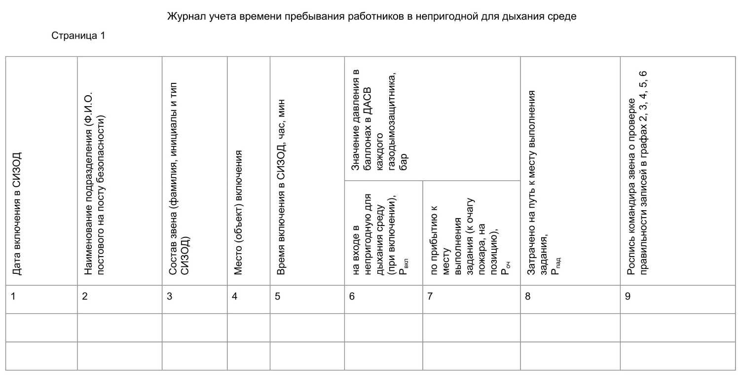 - заполнить журнал учета времени пребывания работников в непригодной для дыхания среде.
