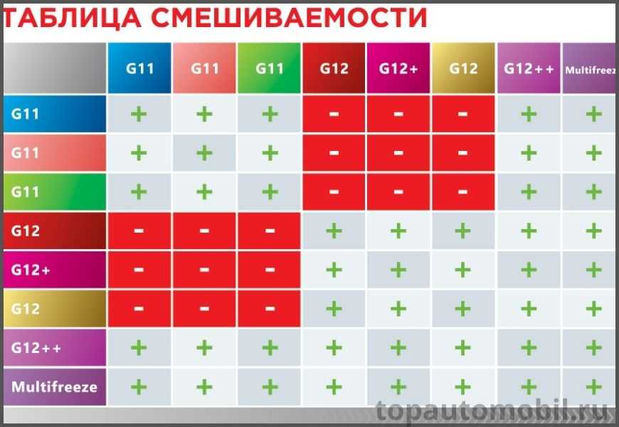 Продукты разных классов не рекомендуется сочетать друг с другом из-за существенных отличий физико-химических свойств. Жидкости можно смешивать только при условии, что они изготовлены по одним и тем же стандартам. О том, как смешивать антифриз разных марок, можно узнать из таблицы совместимости: