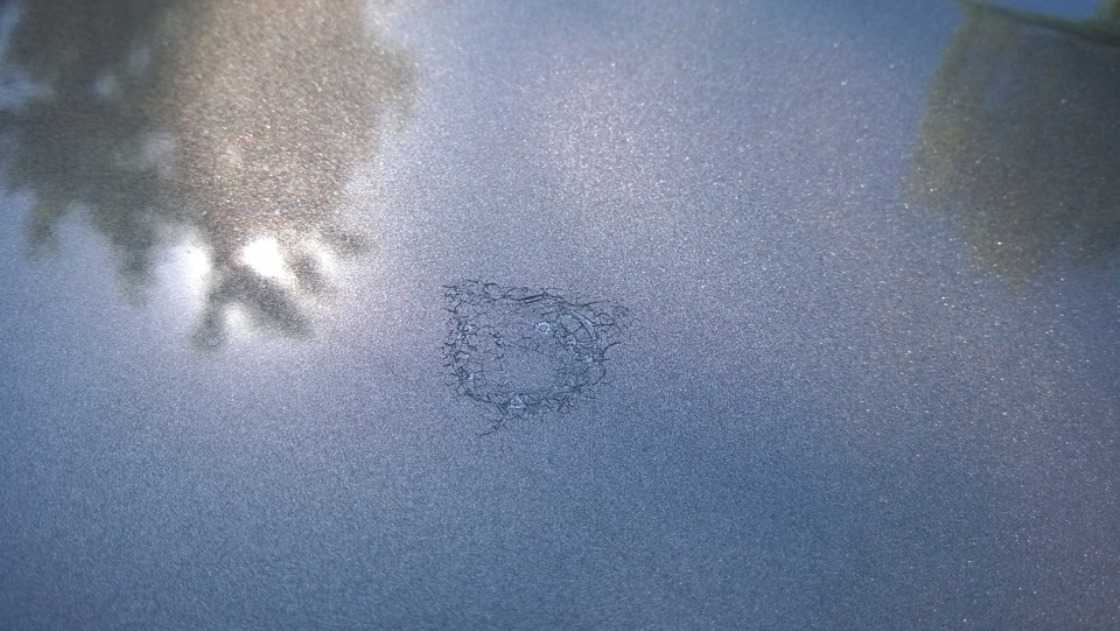 Если сразу не убрать птичий помёт, то на его месте могут остаться вот такие некрасивые следы. Дефекты такой глубины убираются только покраской.