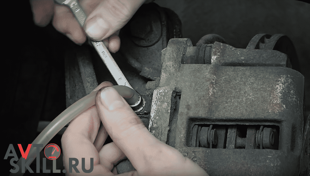 Теперь необходимо прокачивать тормозную систему. Устанавливаем к штуцеру колесного цилиндра гаечный ключ и сверху надеваем силиконовую трубочку для слива жидкости. Помощнику (желательно делать это с ним) необходимо нажимать на педали тормоза — примерно по 4-5 нажатий. В это время необходимо повернуть гаечный ключ, чтобы жидкость потекла по шлангу в приготовленную емкость доя сбора старой жидкости.