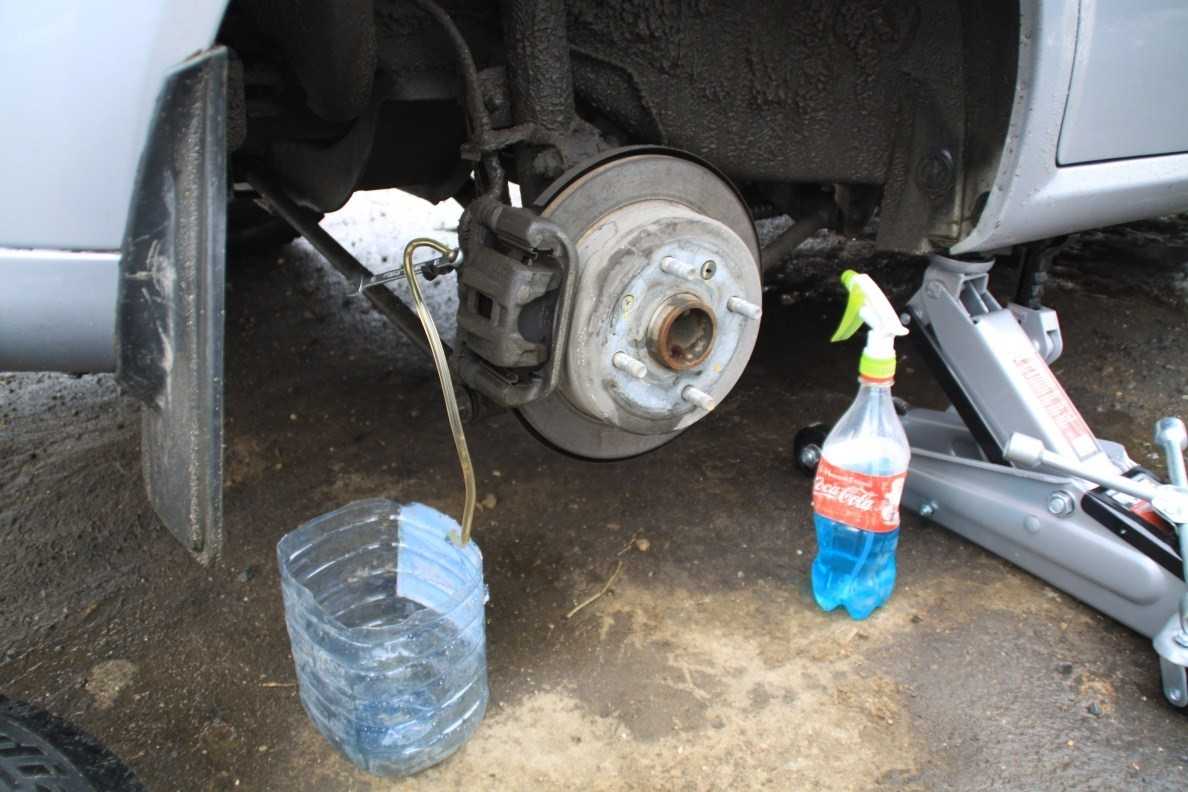 Если используются домкраты, то с автомобиля сначала демонтируют задние колеса. Со штуцеров тормозных колесных цилиндров нужно снять колпачки, в дальнейшем на каждый из штуцеров по очереди надевать силиконовый шланг.