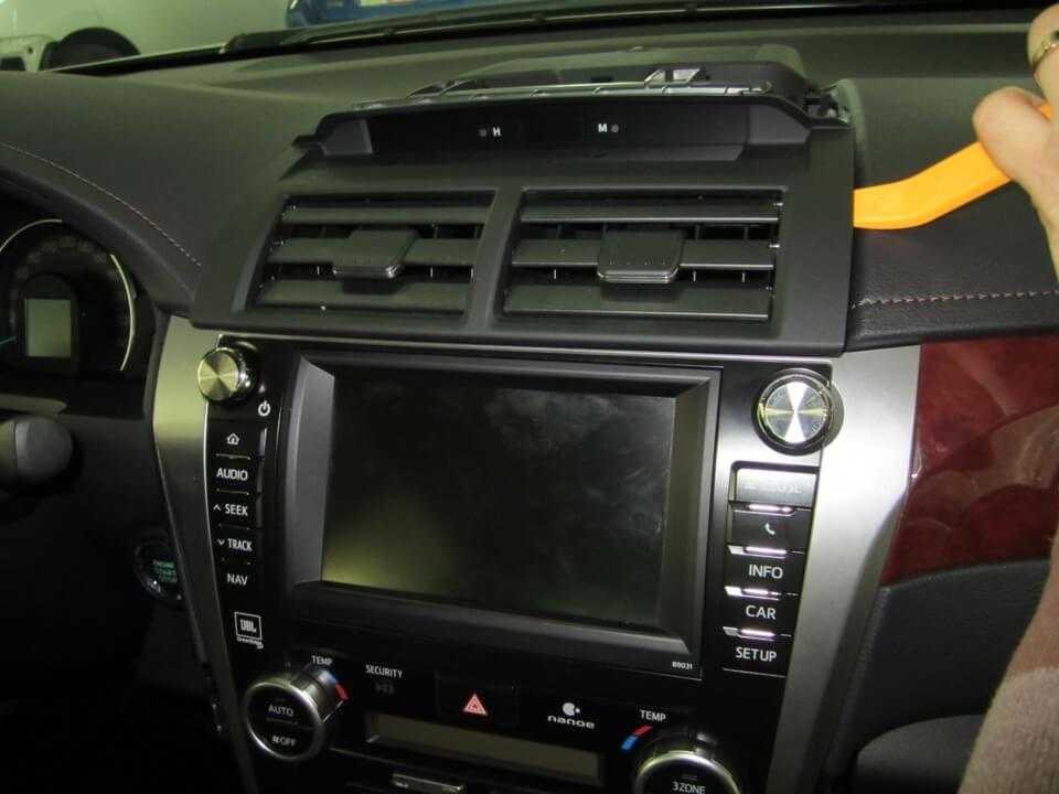 Демонтаж панели Камри требует подготовки, которая заключается в освобождении бардачка и дисковода от лишних вещей. После этого необходимо включить двигатель и поставить нейтральную скорость на коробке передач.