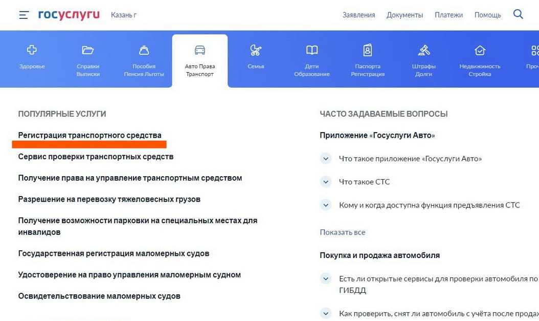 - Далее нас интересует раздел «Авто, права, транспорт» – и «Регистрация транспортного средства»: