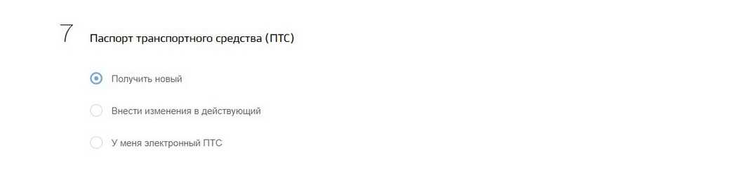 Обратите внимание на Раздел 7 – там нужно отметить пункт «Получить новый ПТС», ведь при отсутствии свободного места в старом ПТС вы не сможете вносить в него изменения – поэтому только замена на новый паспорт.