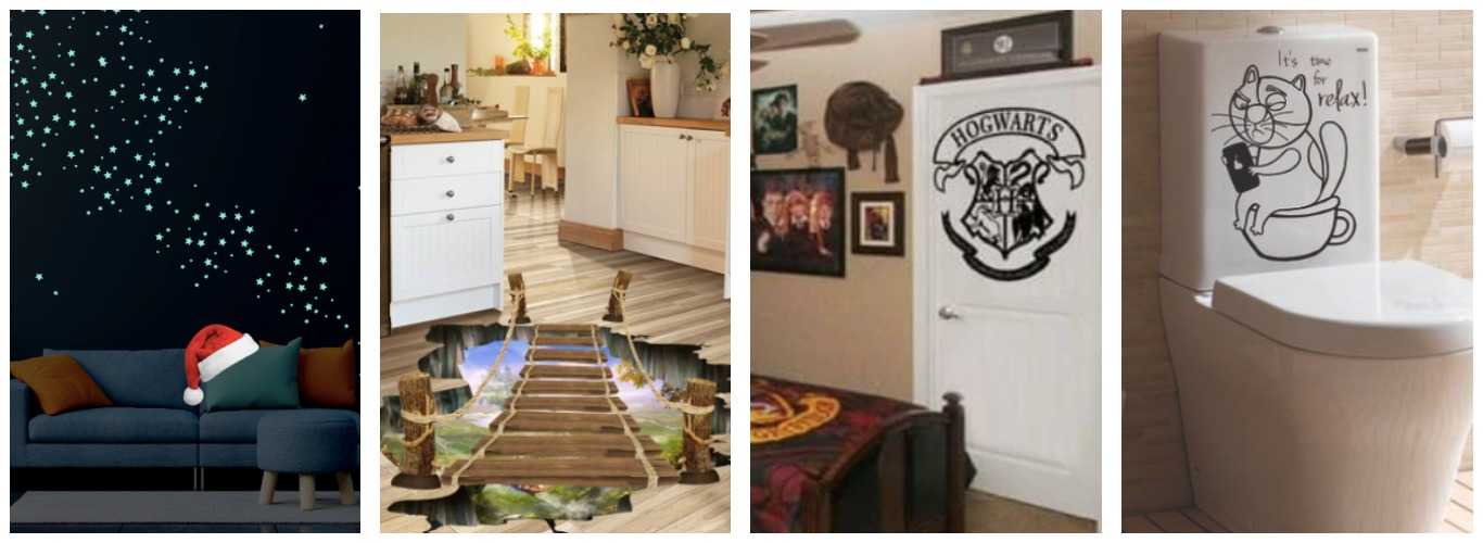 Интерьерные наклейки можно клеить на потолки, полы, стены, мебель и даже на крышку унитаза.