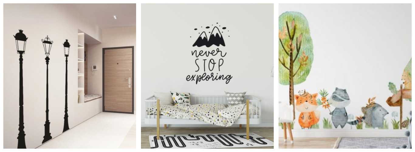 Благодаря наклейкам на обоях можно не только менять дизайн помещения, но и скрыть некоторые дефекты стен. Так же можно обновить старую мебель или загримировать отколовшуюся краску.