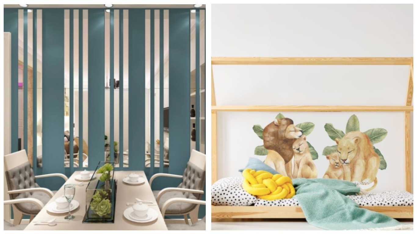 Интерьерная наклейка может быть частью дизайна, перекрывать дырки или рисунки на обоях, заполнить пустое пространство на стене или даже компенсировать нехватку мебели.