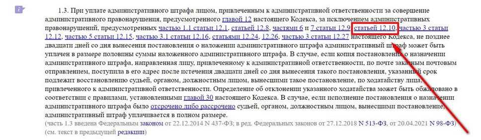 - Теперь снова взглянем на положения ч. 1.3 ст. 32.2 КоАП, где приводятся статьи-исключения, на которые скидка не распространяется. Есть ли среди них названные выше статьи? Оказывается, есть. Так, в числе исключений можно заметить ст. 12.10 Кодекса: