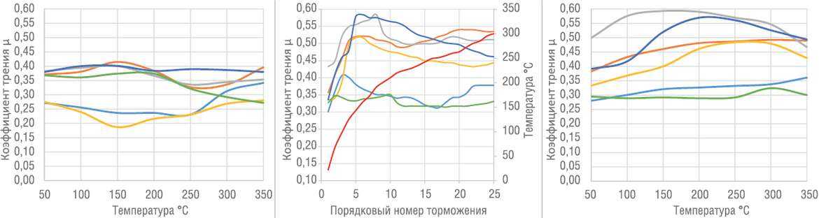 График 1 (слева). Зависимость коэффициента трения от температуры до «нагревного» цикла. График 2 (посередине). Величина коэффициента трения колодок и температуры тормозного диска при втором цикле из 25 последовательных торможений. График 3 (справа). Зависимость коэффициента трения от температуры после двух «нагревных» циклов