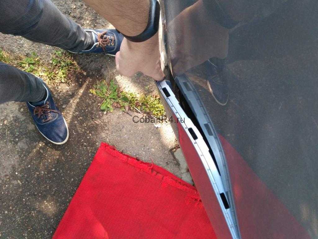 - Поддеваем отвёрткой с прямым шлицом декоративную пластиковую накладку со стороны лобового стекла. Аккуратно опускаем накладку, преодолевая сопротивление пластиковых фиксаторов. Накладка остаётся в руках.