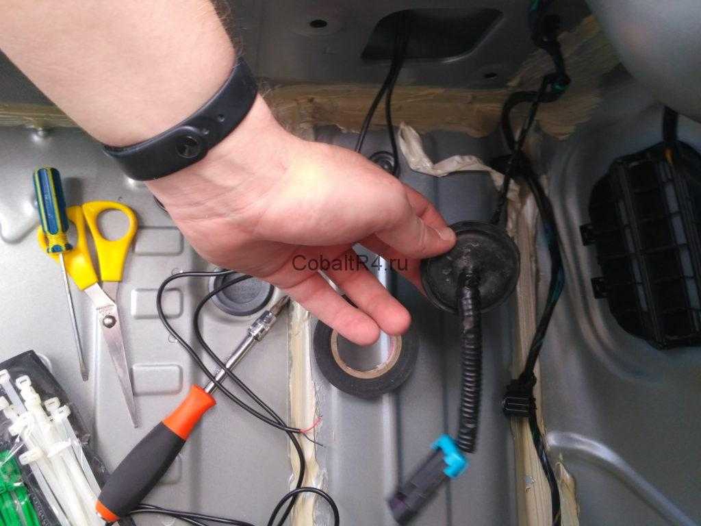 - Проложить провод из салона в дверь автомобиля через гофру.