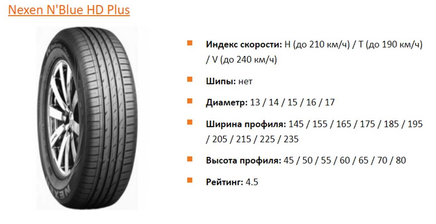 Nexen N’Blue HD Plus хорошо «удерживает» дорогу, позволяет легко преодолевать даже в крутые повороты. Несмотря на сравнительно высокое качество изготовления отличается низкой стоимостью. Резина обозначенная индексом V позволяет передвигаться на скорости до 240 км/ч.