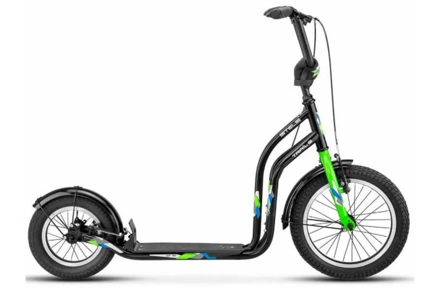 Вошел в ТОП 10 самокат внедорожный STELS Trail-5 16″/12″ V010. Он оборудован надувными колесами диаметром 406 и 305 мм. Они сглаживают неровности на дороге: мелкие ямы, камни. Подойдёт для передвижения по грунту. Основание противоскользящее. Изделие произведено из алюминия. На руле установлены ручки ручного тормоза. Привод тормоза на переднее и заднее колесо. Цельная конструкция рамы обеспечивает надежность при экстремальной езде. Модель оборудована подножкой, можно оставлять его в любом месте в положении стоя.