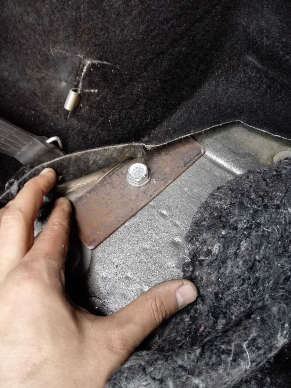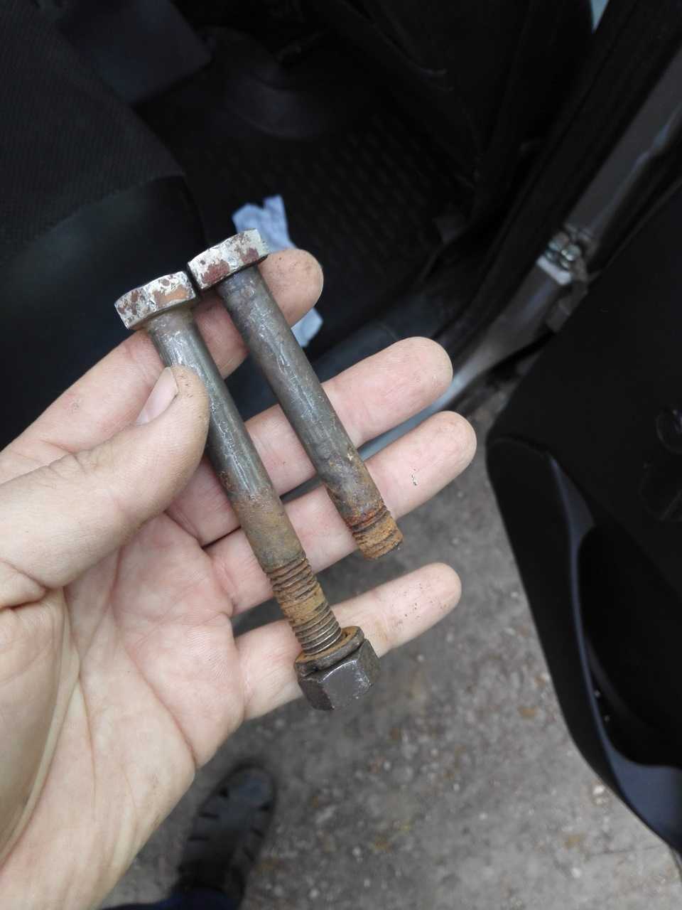 Открутить левую гайку не удалось — она намертво прикипела за это время и при попытке открутить болт порвался. На болте было написано 58 — прочность слабая совсем. Кроме того нужно ставить более широкие шайбы под эти болты со стороны багажника.