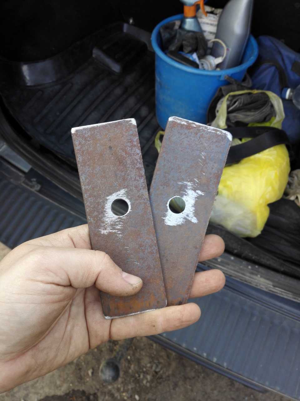 Я распилил её болгаркой на 2 половины и просверлил отверстие под болт. Острые края сточил на наждаке. В результате получились вот такие пластины: