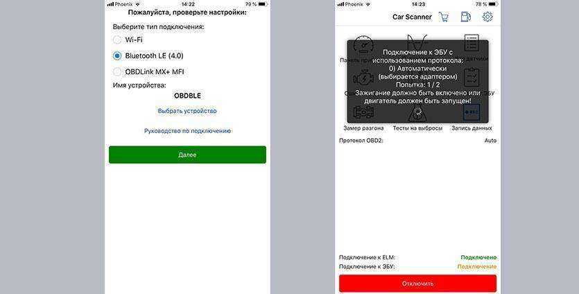 Как настроить работу по смартфону: подключаем сканер к OBD2 разъему автомобиля, включаем зажигание, запускаем приложение сканера на iPhone и подключаемся к нему.