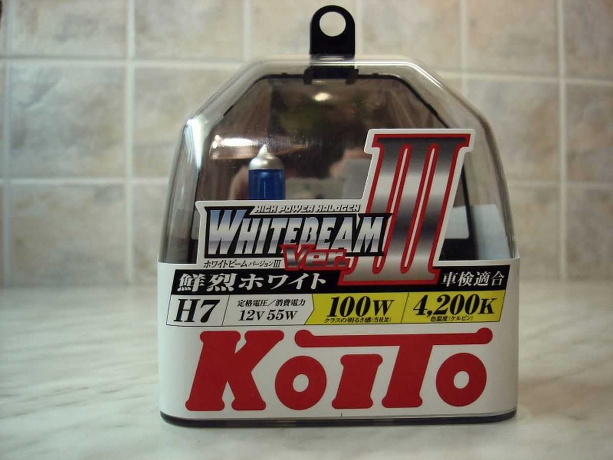 KOITO Whitebeam — японская модель повышенной яркости, почти вдвое ярче конкурентов. Имеет цветовую температуру 4200K, что наиболее близко к естественному дневному освещению, однако в дождь видимость заметно теряется. Отличается колбой синего цвета. Приобрести пару koito можно за 2000 р.